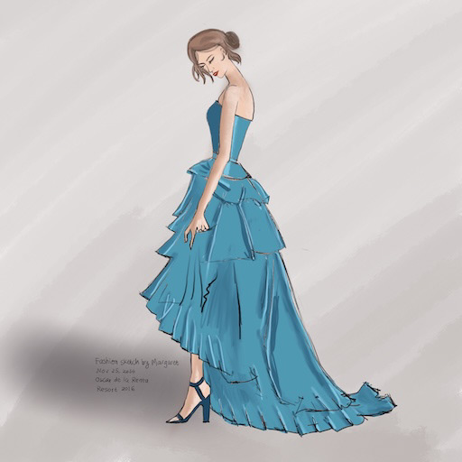 My fashion sketch of a dress from Oscar de la Renta Resort 2016 collection. I love its elegance with cascading layered ruffles with asymmetrical hemlines, its striking vibrant blue color, and the pensive pose. What a beautiful look!